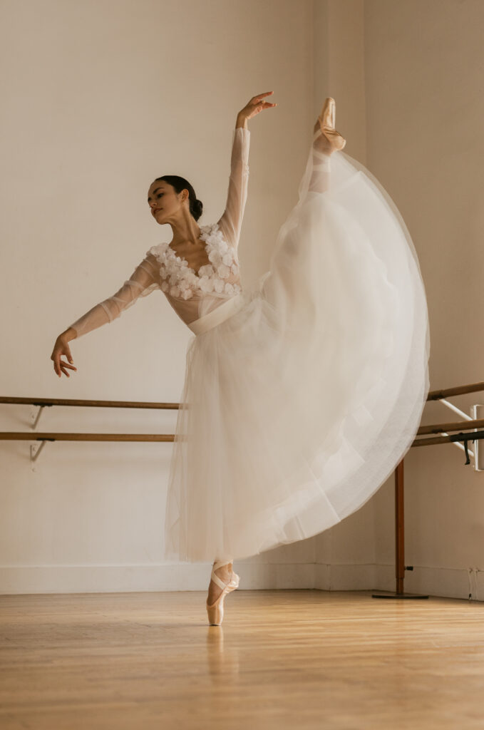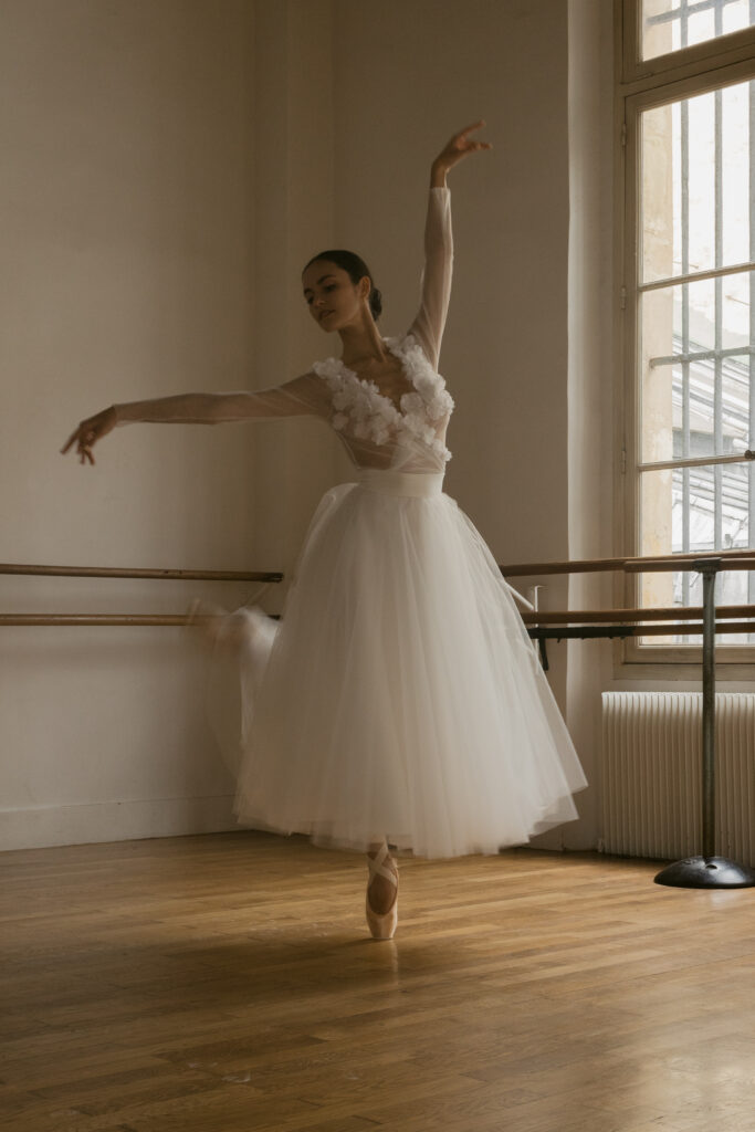 Pour marquer cette décennie, Mariana a imaginé un tutu unique. Sa jupe, aérienne comme un souffle, déploie un jeu de transparence et de volumes qui rappelle les cygnes, les nymphes, les rêveuses. Mais la véritable signature réside dans le cache-cœur délicatement brodé de fleurs, pensé comme une seconde peau. Les motifs floraux, brodés à la main, évoquent les jardins romantiques que l’on aime tant : un travail patient, presque méditatif, qui incarne ces dix ans de savoir-faire. Chaque pétale rend hommage à la précision artisanale qui fait l’âme d’Atelier Swan.