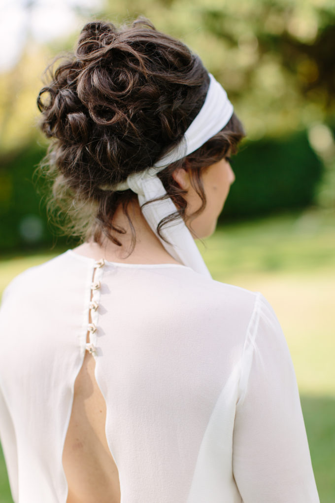Nous avons pris un immense plaisir à lui créer sa robe de mariée sur mesure, épurée et minimaliste aux petits détails en bois. De la soie, de la légèreté et un jeu de transparence. Audrey a également souhaité que l’on utilise le tissu de la robe de mariée de sa maman afin de lui créer un bandeau à mettre dans les cheveux.