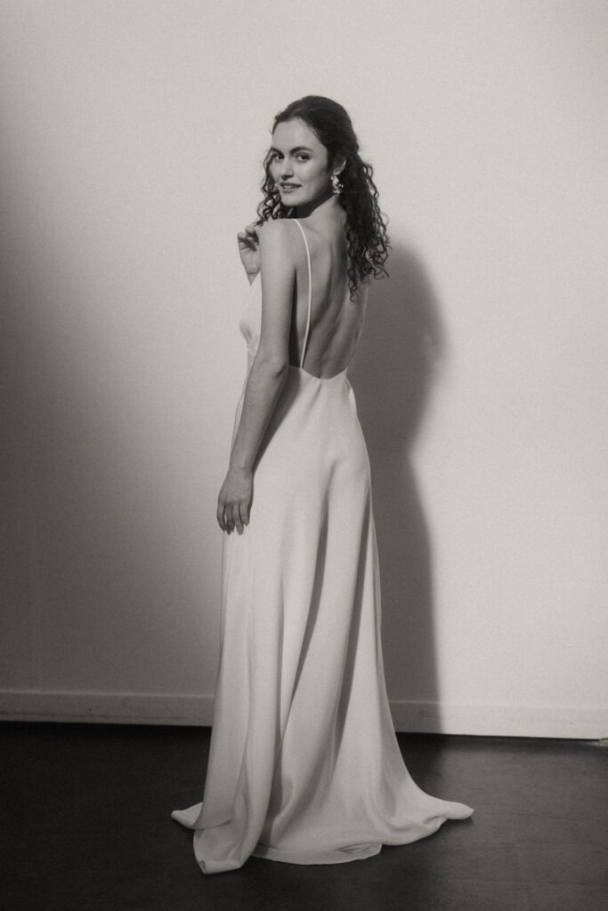 Une robe en crêpe légèrement satiné. La coupe en biais épouse gracieusement le corps, tandis qu’un décolleté en V à l’avant est rehaussé par une découpe sous la poitrine. Le dos, entièrement décolleté, est soutenu par de fines bretelles, son minimalisme ajoute une touche d’élégance à la silhouette.