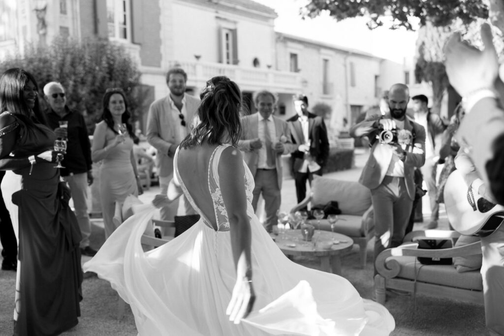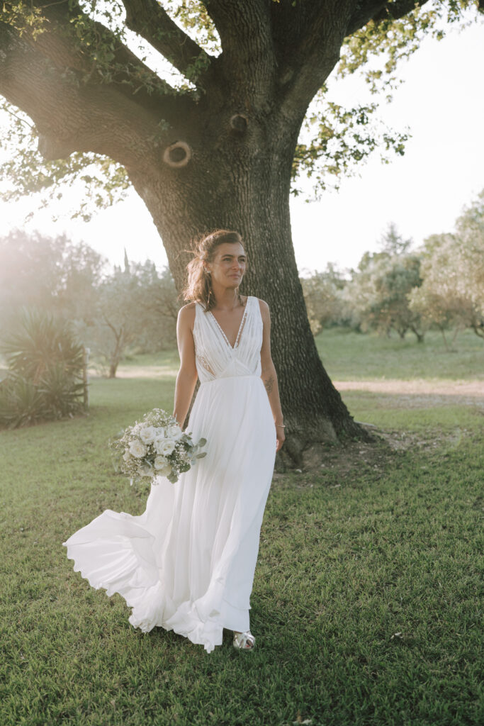 Autour d’elle, une équipe de prestataires talentueux a sublimé ce moment : la mise en beauté signée Billie and Clyde, les images lumineuses d’Ozaria, la douceur du lieu du Mas d’Arvieux, la cuisine délicate de Maison Nans, le tout orchestré avec fluidité par The Beauties Band. Un mariage comme une évidence.