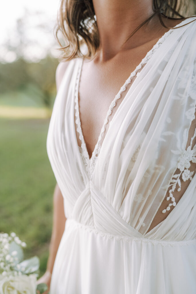 Une parenthèse provençale au Mas d’Arvieux, et une mariée radieuse dans l’une de nos créations : la robe Cristal. Pour dire « oui, Élodie a choisi Cristal, une robe pensée comme un souffle de poésie. Confectionnée en mousseline de soie et tulle brodé de Caudry, elle se distingue par un drapé délicat en mousseline apportant douceur et structure ainsi qu’un jeu de transparence subtil grâce au tulle brodé. Sous la lumière dorée de Provence, la robe semblait danser d’elle-même, révélant la grâce naturelle d’Élodie.